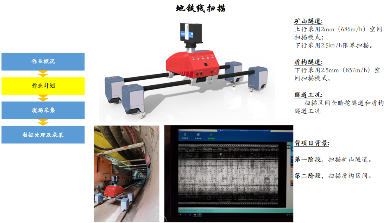MS100移动三维扫描系统是一套用于隧道断面扫描、病害扫描和限界扫描的全自动移动扫描测量系统。它快速准确测量隧道结构参数和表观病害数据。系统主要由三维激光扫描仪. MDC移动扫描小车、TSD隧道三维扫描软件、平板电脑组成。移动扫描小车能够智能定速巡航,结合TSD隧道三维扫描软件快速稳定地处理数据并实时呈现扫描影像图。